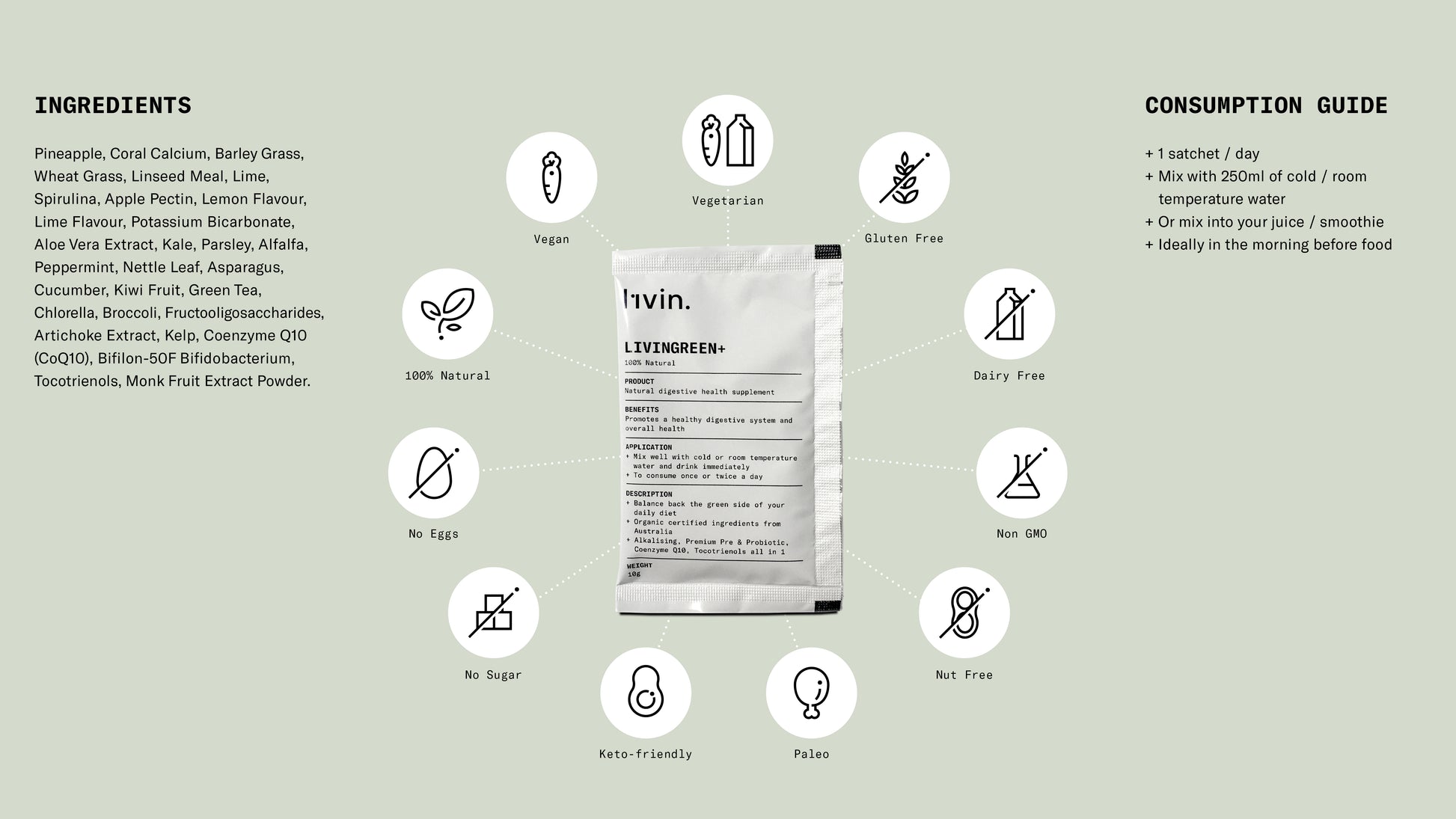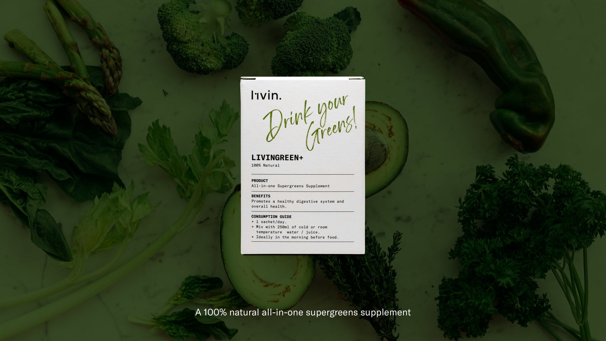 Livingreen+ is an all-in-one supergreens supplement formulated with over 28+ natural and whole-food sourced ingredients, herbal extracts, vitamins, minerals, probiotics & prebiotics.